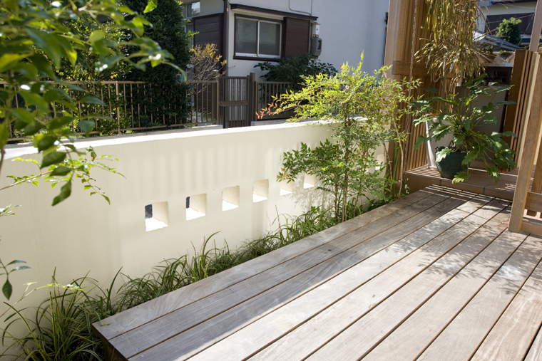 高低差がある立地ですが、ブロック塀の高さをなるべく低くしたり、開口部を設けたりすることで圧迫感を少なくしています。