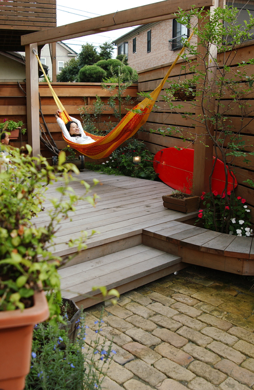 プライバシーを確保したお庭には、古レンガのテラスと低めに設定したウッドデッキによってバランスの良い仕上がりになっています。