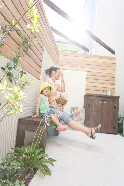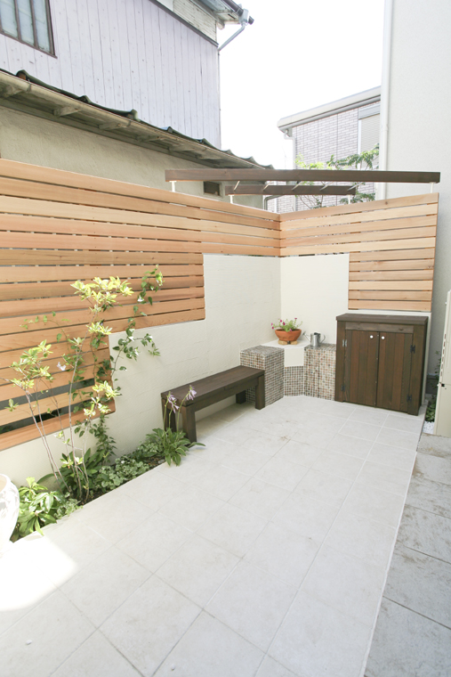 1階部分はリビングが2階の為使う機会が少なく暗いイメージだったのを、白のタイルや塗り壁、木の色を生かしたお隣との目隠しフェンスなどで明るくて使いやすいスペースに生まれ変わりました。こげ茶のベンチや収納庫、モザイクタイルなどがアクセントになっています。
