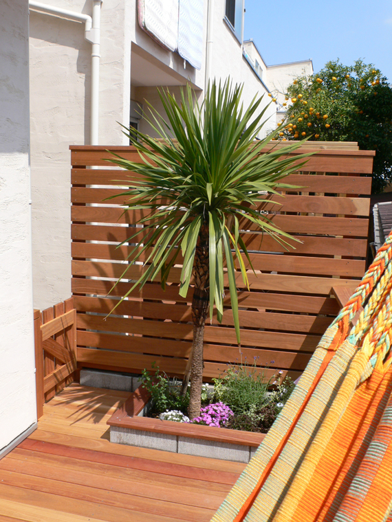 お庭部分にウッドデッキ、中庭のタイルテラスを延長して、セランガンバツ材と穴あきブロックを組み合わせたフェンスを設置しました。