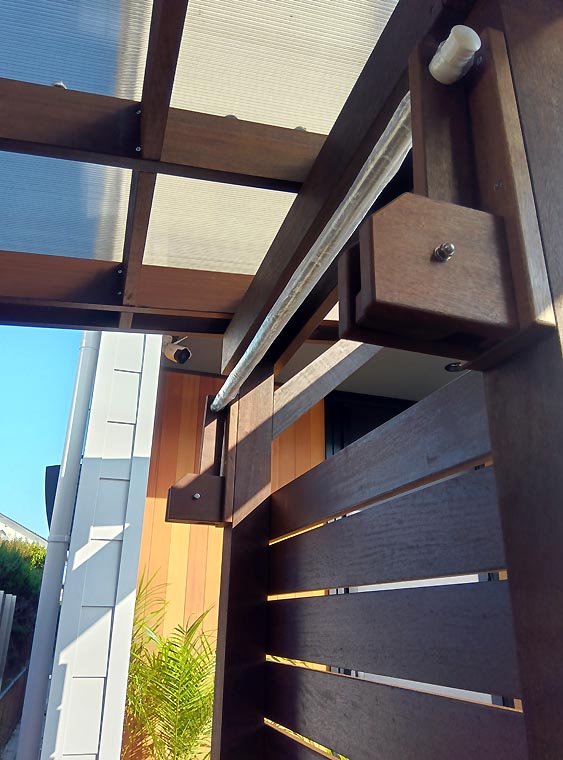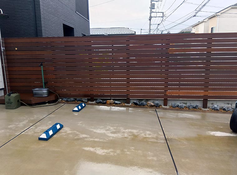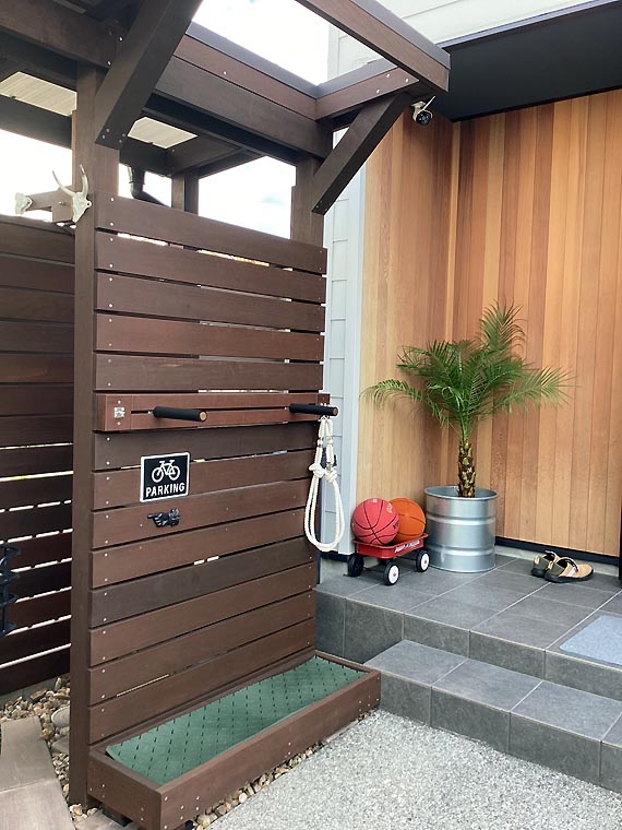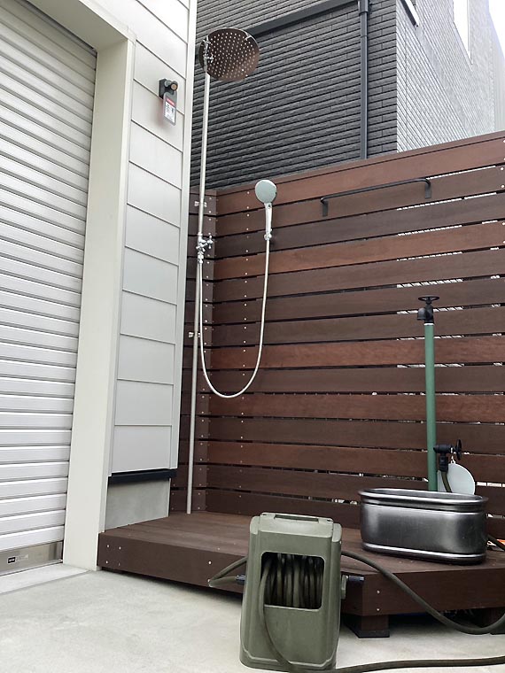 隣地境界には高さのある目隠しフェンスに大きなヘッドのシャワー水栓を設置*