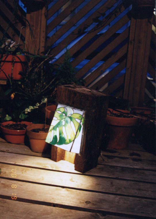 人気のモンステラ柄をステンドグラスで作り、枕木と合わせました。